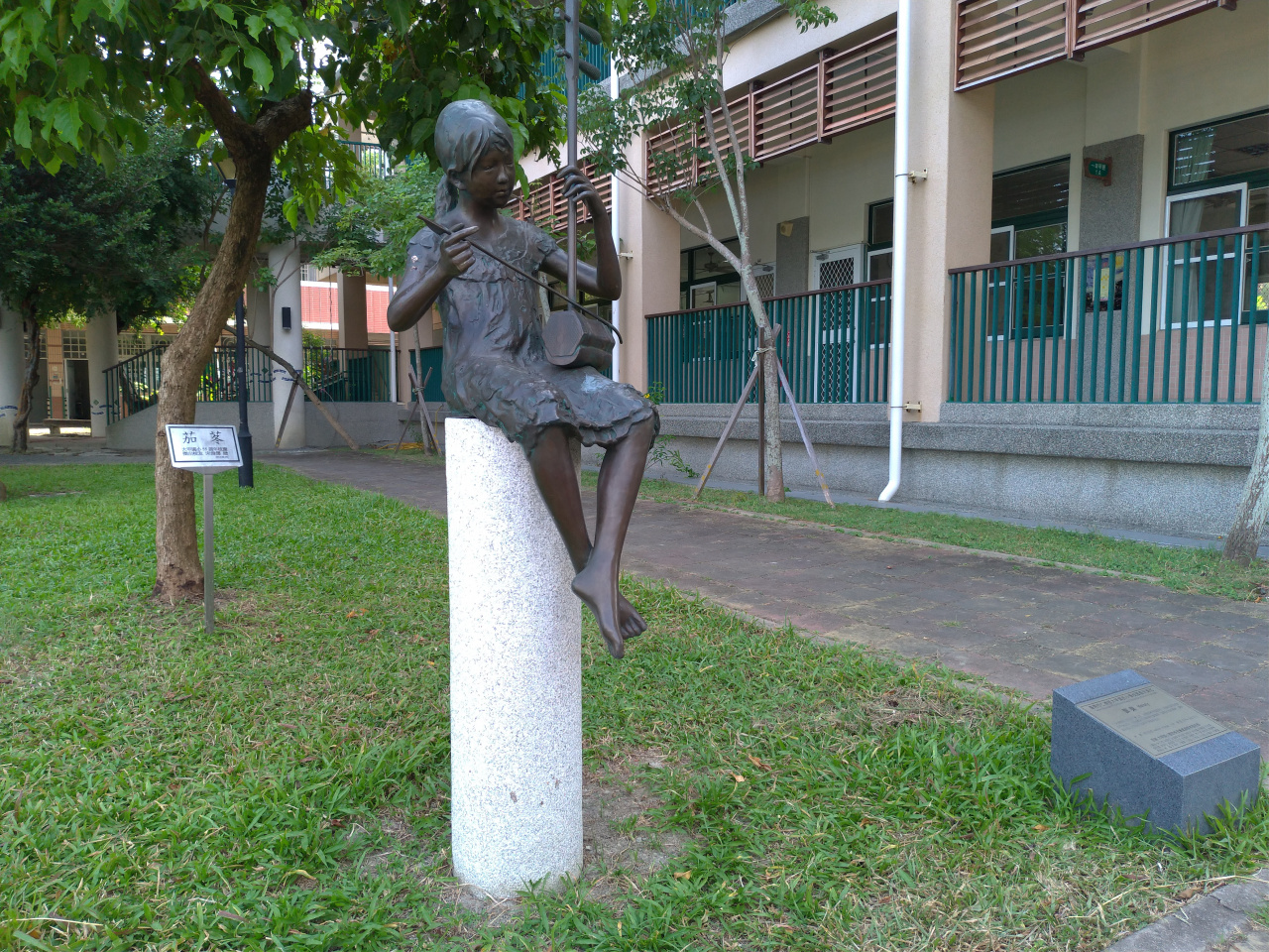 該藝術品採用側扁式的獨特技法,創作靈感來自校園內廣植的雞蛋花,還有小男孩演出低音大提琴時站立在小板凳的神韻,琴面融合雞蛋花的鏤空意象,人小志氣高表徵學習音樂的堅強意志,音樂陶冶孩童性情,更是引領夢想起飛的開始。