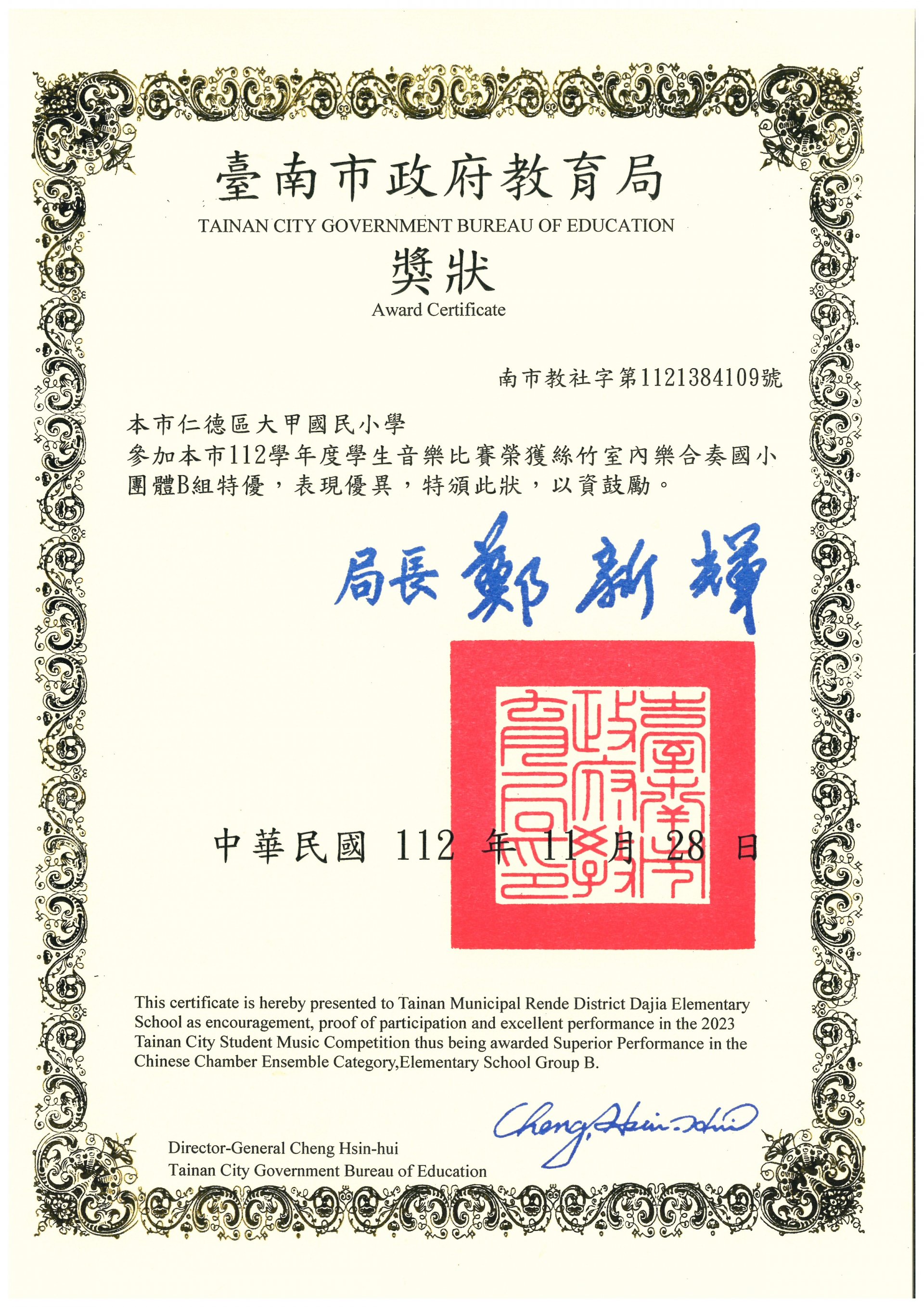 絲竹室內樂合奏國小團體 B 組特優(第一名)